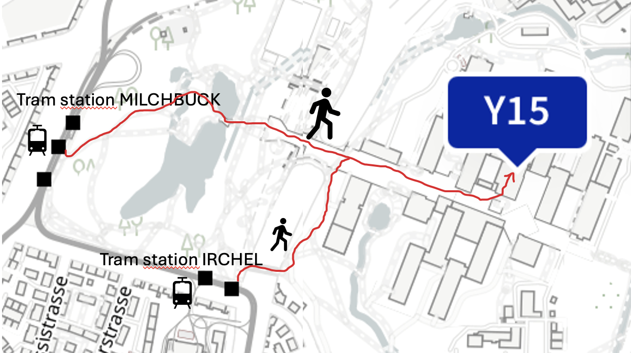 The campus can be reached directly (no transfer required) using tram number 14 (bound for 'Triemli') stopping at the 'Milchbuck' stop or tram number 10 (bound for 'Bahnhofplatz / HB') also stopping at the 'Irchel' stop.